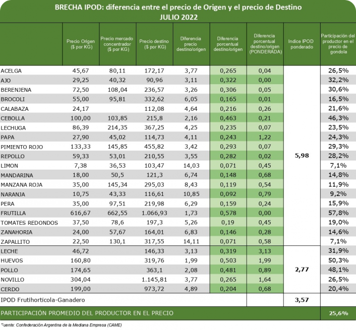 Según el Índice de Precios en Origen y Destino (IPOD) elaborado por el sector de Economías Regionales de la Confederación Argentina de la Mediana Empresa (CAME), el consumidor inició el segundo semestre del año pagando $3,6 por cada $1 que recibió el productor de agroalimentos. Es decir, los precios de los 24 productos agropecuarios que componen la canasta IPOD se incrementaron 3,6 veces desde que salieron del campo (origen) hasta que llegaron a la góndola (destino) durante julio.