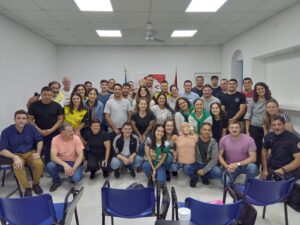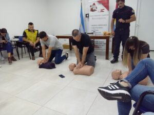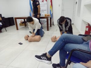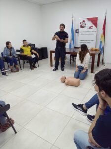 El Lunes 26 de Junio, continuando con la capacitación a cargo del cuerpo de Bomberos Voluntarios de nuestra ciudad, se dictó el curso de Primeros auxilios y RCP. El Bombero Manuel Machuca, primero hace una presentación de algunas situaciones imprevistas que pueden suceder y de qué manera debemos ayudar a la persona que sufre alguna descompensación y como identificar las situaciones que determinan como debemos proceder. Luego se realizó, de forma dinámica y practica el taller de RCP.