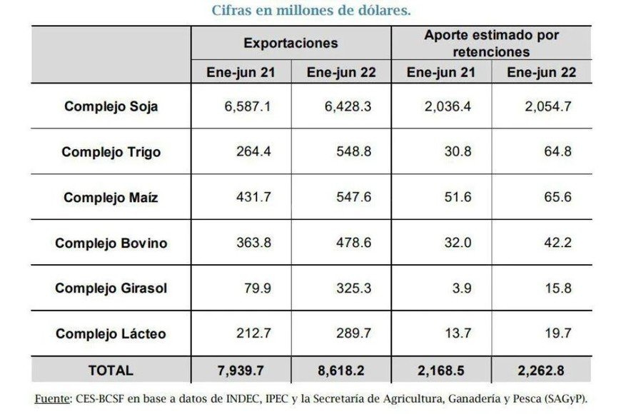 Un análisis del Centro de Estudios y Servicios (CES) de la Bolsa de Comercio de Santa Fe sobre las exportaciones de los principales complejos agroindustriales de la provincia, estimó en $256.637,5 millones de pesos el aporte al fisco nacional del sector agroindustrial en materia de retenciones en el primer semestre del año.